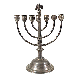 7 armiger Chanukka Leuchter, Silber, Mariage aus verschiedenen Epochen, mittig Tora-Zeiger mit russischen Punzen gestempelt 1878 84, Rest später, H = 25,5 cm, total 276 g