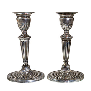 1 pair of candlesticks, neoclassical, BIRMINGHAM 1912/13, SILVER 925/000, sig WB Ld, oval foot with spherical rim, the baluster shaft with columnar relief and widening towards the top, the drip catcher is detachable, foot approx. 10.5 x 8.2 cm, h = 18.0 cm, total 655 g (foot filled with putty)