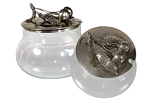 Jam jar, German mid-20th century, lid SILVER 800/000, sculptured cherries with leaf and a small piece of branch, d = 12.0 cm, h = 10.0 cm, total 207 g, the whole best with jam from the cherry !!!