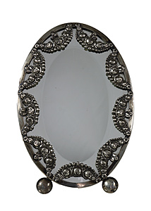 MIRROR, probably Belgium 1920s, SILVER, signed, oval faceted mirror framed by rose garlands, the reverse with hoop stand, 2 lenticular feet, h = 17.0 cm, total 293 g