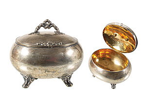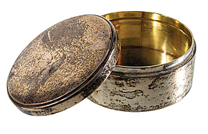 Necessaire small box, ART-DECO 1940/50s, SILVER 925/000, signed TIFFANY & CO 21621 MAKERS 2791 STERLING SILVER, cylindrical box with bayonet catch, d = 73.8 mm, h = 33.0 mm, monogrammed: J.P.F, total 134.6 g