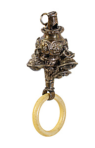 Kinderrassel um 1880/90er Jahre, SILBER gemarkt, überkreuz angeordnete Glöckchen, insgesamt 6 Stck., an einem Ende eine Pfeife, L = 97,5 mm, mit Gebrauchsspuren !