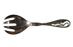 Serving fork/salad fork circa 1920, GEORG JENSEN, SILVER 830/000, signed N° 42, handle with stylized leaf and vine handle, spoon with fine hammering, l = 15.3 cm, total 30.6 g