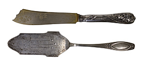 Lot: JUGENDSTIL um 1900/15, SILBER 800/000, 1 Tortenheber mit graphischem Design, L = 28,5 cm; 1 Tortenmesser, Klinge mit Resten von Vergoldung, floral ornamentiert, L = 26,5 cm, total 152 g