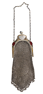 Small evening bag, JUGENDSTIL c. 1900, bow with red and bronze-colored enamel inlay, clasp set with blue stones, eyelet mesh age-related sagging in some places, h = 20.5 cm (without chain)