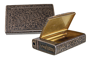 TABATIERE, Russsland 1886, SILBER 84 Zolotniki, sig. NC AP 1886 Meistermarke, umseitig mit feiner Nielloverzierung, seitliches Fach für Streichhölzer, hochwertig verarbeitet, (Reibefläche fehlt), guter/sehr guter Zustand, innen vergoldet, ca. 105 0 x 24,5 x 64,5 mm, total 182,2 g