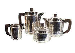 4-piece service 1950s, SILVER crescent moon & crown with eagle 835/000, coffee pot h = 20.5 cm, d = 11.0 cm, 1 teapot h = 16.3 cm (upper rim with dedication), 1 milk jug and 1 sugar jar with lid, grained wooden handles and knobs, all vessels with series N°, nice condition ! Total 1,58 kg