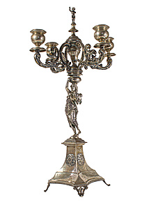 A magnificent 4-armed candlestick, AUSTRIA/UNGARN, late 19th century, hallmarked SILVER, baroque upper part, the top with a small putto with cornucopia, central fully sculpted female figure, removable upper part (holder with break-out), the base with floral rosettes and beaded rim, flared feet, h = 60.5 cm, total 1.716 kg