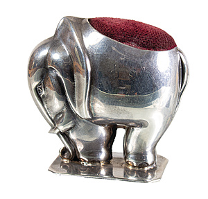 Pincushion, ELEPHANT, SILVER 925/000, sig. DP (import mark London 1988), sculpted elephant with velvet cushion, h = 44.0 mm