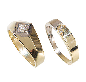 Lot: 2 men's rings, GG/WG 585, 1 ring, 2 brilliant-cut diamonds approx. 0.035 ct tw/w-si, RW approx. 60; 1 ring, 1 brilliant-cut diamond approx. 0.15 ct tw/w-Vsi/si, RW approx. 60.5, total 9.2 g