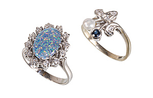 Lot: 2 ladies' rings, WG 585, 1 ring, 4 brilliant-cut diamonds approx. 0.07 ct w-si, 1 pearl and 1 sapphire, RW approx. 53.5; 1 ring, opal triplet, 12 diamonds approx. 0.30 ct white, RW approx. 54.5, total 7.2 g