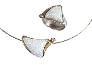 Lot: SILVER 925/000, 1 ring, synth. opal, 1 brilliant-cut diamond approx. 0.04 ct w-si, RW approx. 55.5; 1 necklace with synth. opal, 1 brilliant-cut diamond approx. 0.04 ct w-si, hoop, L = 41.8 cm