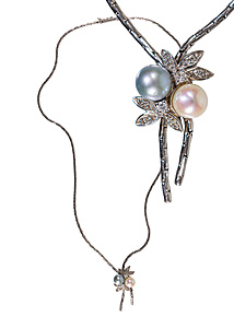 VINTAGE necklace 1970s, WG 585/000, 2 Akoja pearls, D = 6.7-7.0 mm and 6 diamonds white, small box clasp with safety eye, L = 44.5 cm, total 17.3 g