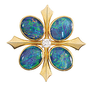 Brooch VINTAGE 1970/80s, GG 750/000, 4 opal triplets with intense blue and green hues, central brilliant-cut diamond approx. 0.12 ct tw-vsi, brooch approx. 30.0 x 30.0 mm, total 8.8 g