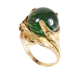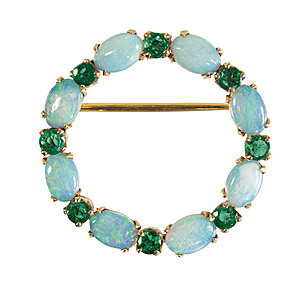 Brooch CIRCLE, GG 585/000, each wreath with 8 opals approx. 2.5 ct (6.0 x 4.0 mm), and 6 emeralds approx. 0.96 ct (faceted), brooch D = 27.0 mm, total 4.3 g
