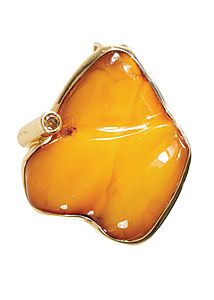 Heavy worked brooch, GG 750/000, sig. AF, amber BUTTERSCOTCH, cognac-colored diamond approx. 0,20 ct, approx. 40,0 x 47,5 mm, double pin, also wearable as pendant, total 28,1 g, beautiful unique piece !