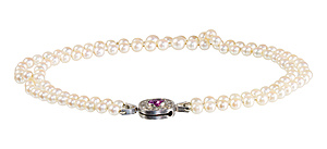 Double-row Akoja pearl necklaces (graduated), clasp WG 585/000, signed, central tourmaline (fac.), in the wreath 10 brilliant-cut diamonds ca. 0.25 ct tw-vsi, D = 5.5-8.4 mm, L = 40.5 cm