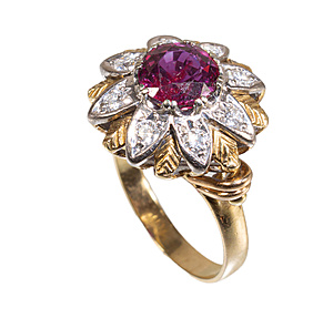 Ring, GG/WG 333/000, top set with central ruby approx. 0.45 ct, 6 pcs. 8/8-cut diamonds approx. 0.045 ct white, RW approx. 50