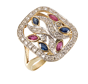 Ring, WG/GG 585/000, top set with 40 8/8-cut diamonds approx. 0.40 ct and 2 diamonds 0.04 ct, all white, 3 navette-cut rubies approx. 0.3 ct and 3 sapphires approx. 0.3 ct (all faceted), ring head approx. 16.0 x 18.5), RW approx. 56, total 4.3 g