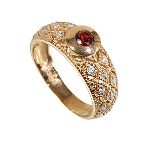 Ring, GG 333/000, red faceted stone, in the side ornament white stone setting (faceted), RW approx. 54.5