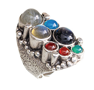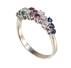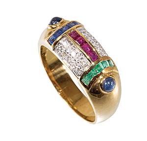 Ring, GG 750/000, 20 brilliant-cut diamonds approx. 0.20 ct tw-si, 4 rubies, 5 sapphires, 5 emeralds all carré-cut, 2 sapphire cabochons, RW 60.5, total 8.8 g