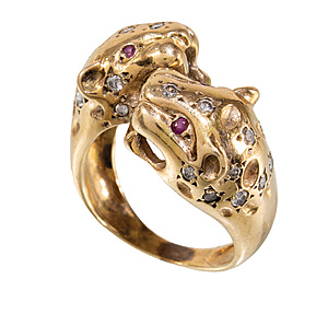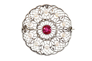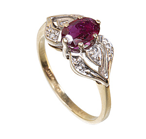 Ring, GG 333/000, roter facettierter Stein, im seitlichen Ornament weißer Steinbesatz (facettiert), RW ca. 54,5