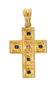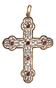 Pendant CROSS, GG/WG 750/000 (tested), 6 rubies approx. 0.7 ct faceted, approx. 43.0 x 67.7 mm, total 9.7 g