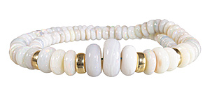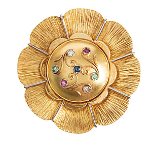 Brosche KREIS, GG 585/000, im Kranz je 8 Stck. Opale ca. 2,5 ct (6,0 x 4,0 mm), u. 6 Smaragde ca. 0,96 ct (facettiert), Brosche D = 27,0 mm, total 4,3 g