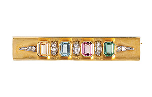 Ring, GG 750/000, 20 Brillanten ca. 0,20 ct tw-si, 4 Rubine, 5 Saphire, 5 Smaragde alle im Carré-Schliff, 2 Saphircabochons, RW 60,5, total 8,8 g