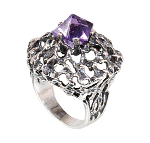 Ring, GG 585/000, luminous baguette-cut amethyst approx. 5.2 ct, all-round with open-worked gader, RW approx. 57, total 6.4 g