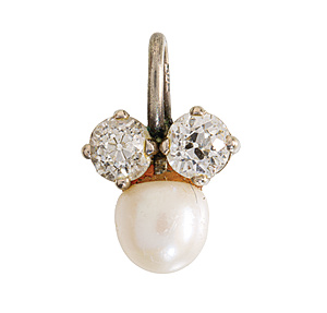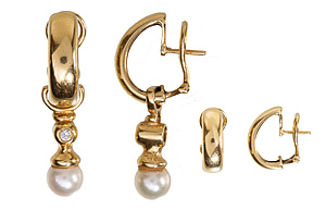 1 Paar Ohrhänger, 1/2 Creolen mit Clip u. Stift, GG 750/000, signiert LW, 2 Brillanten ca. 0,10 ct tw/vsi, Akoja-Perlen D = 7,2 mm, H = ca. 37,0 mm, total 14,3 g