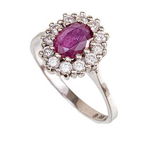 Ring, WG 585/000, central brilliant-cut diamond approx. 0.20 ct w-si, 6 further brilliant-cut diamonds in the wreath, 18 navette-cut rubies (faceted) on the outside, approx. 1.6 ct, ring head approx. 18.2 mm, RW approx. 53, total 6.5 g
