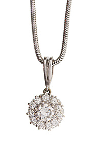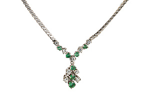 Lot: GG 585/000, 1 pair of ear studs, 2 brilliant-cut diamonds c. 0.09 ct tw-vsi, c. 28.6 x 17.0 mm; 1 necklace, in the display part 1 brilliant-cut diamond c. 0.12 ct tw-vsi, H = 21.0 mm, L = 44.5 cm, settings and bars WG, total 15.6 g