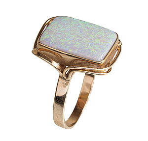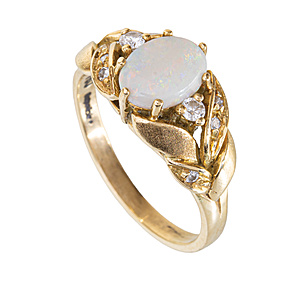 Ring, GG 585/000, zentraler Opal mit sehr schönem Farbenspiel (grün, rot, gelb u. blau) ca. 1,0 ct, 8 Brillanten 0,14 ct w-vsi, RW ca. 54,5