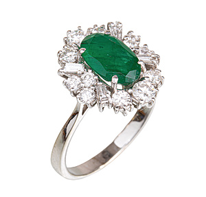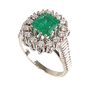Entourage-Ring, WG 750/000, zentraler Smaragd ca. 1,6 ct (10,2 x 6,6 mm, facettiert), 12 Brillanten u. 4 Diamanten in Trapezform ca. 1,07 ct w-p, RW ca. 57, total 5,1 g