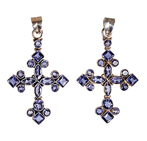Lot of pendants: 2 CROSSES, SILVER 925/000, total 40 pcs. Iolite ? (round, square and navette-shaped, faceted), h = approx. 60.0 mm