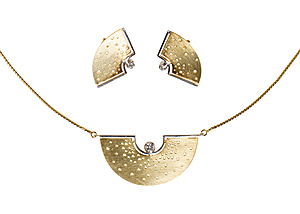Lot: GG 585/000, 1 Paar Ohrstecker, 2 Brillanten ca. 0,09 ct tw-vsi, ca. 28,6 x 17,0 mm; 1 Collier, im Schauteil 1 Brillant ca. 0,12 ct tw-vsi, H = 21,0 mm, L = 44,5 cm, Fassungen u. Stege WG, total 15,6 g