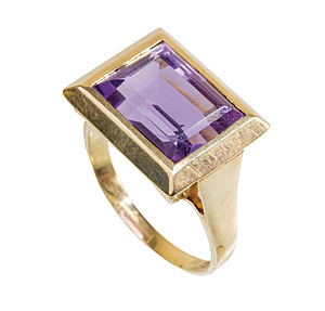 Ring, GG 585/000, leuchtender Amethyst ca. 5,2 ct im Baguette-Schliff, umlaufend mit durchbrochenem Gader, RW ca. 57, total 6,4 g