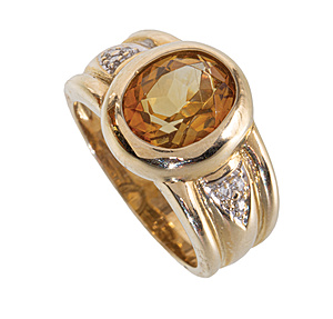 Ring, GG 585/000, central citrine approx. 2.7 ct (10.2 x 8.5 mm). 6 brilliant-cut diamonds 0.06 ct tw-vsi set in white, RW approx. 55.5, total 9.2 g
