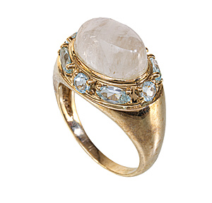 Ring, GG 375/000, dekorativer Mondstein ca. 14,2 x 10,3 mm, (hoch geschliffen), seitlich im Kranz 8 hellblaue Topase (rund u. oval facettiert), RW ca. 63