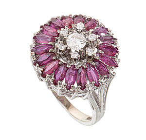 Ring, WG 585/000, zentraler Brillant ca. 0,20 ct w-si, im Kranz 6 weitere Brillanten, außen 18 Rubine im Navette-Schliff (facettiert), ca. 1,6 ct, Ringkopf ca. 18,2 mm, RW ca. 53, total 6,5 g