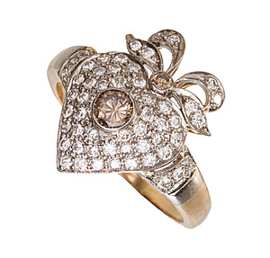 Ring HEART, GG 750/000 (tested), 2 cognac-colored brilliant-cut diamonds approx. 0.25 ct, 56 brilliant-cut diamonds approx. 0.50 ct tw-vsi (rather better) stones set in white, RW approx. 61, total 5.4 g