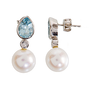 1 pair of ear studs/hangers, WG 585/000, 2 aquamarine drops (faceted) approx. 2.0 ct, 2 small white diamonds and 2 freshwater pearls, H = 23.5 mm