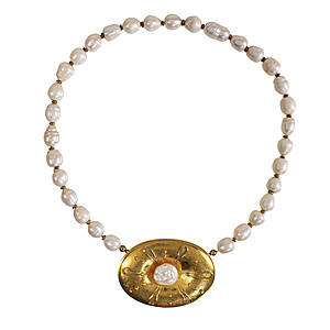 Perlenkette mit dekorativem Vorderteil, Süßwasser-Perlenkette mit Verlängerungsstück, Schließe GG 585/000 (geprüft), L = 41,0 - 46,5 cm, optional dekoratives Mittelteil GG 585/000, signiert JW, mit Süßwasser-Perle, ca. 56,2 x 42,2 mm, total 27,7 g