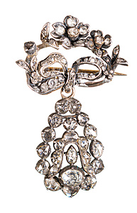 Brooch, mid 18th century, SILVER, pin and parts of the gader in 750/000 gold (reddish), in the upper part, consisting of blossoms, leaves and a bow, 46 white diamond roses, in the drop-shaped hanger a larger diamond rose approx. 5.6 x 5.0 mm and 22 white diamond roses, hanger detachable, height = 47.6 mm, with box !
