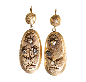1 Paar Ohrhänger, BIEDERMEIER 1.Hälfte 20.Jhd., GG 585/000, abgehängtes Oval mit applizierten Blumen, dezent mit Perlen und farblosem Strass dekoriert, H = 42,5 mm, 1 Blüte fehlt, mit Schatulle !