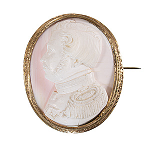 Brooch, VICTORIAN c. mid-19th century, DOUBLÉ, shell-shaped gem, in profile a highly decorated military persom with decorative epaulettes (shoulder scales), gem very plastically worked, rim with delicate ornament, c. 48.4 x 58.2 mm