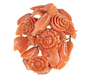 Brosche/Anhänger um 1830/50, GG 585/000, im oberen Drittel ein Vogel, einzeln geschnittene Korallenblüte und Blätter bilden eine homogene Einheit, ca. 28,5 x 33,3 mm