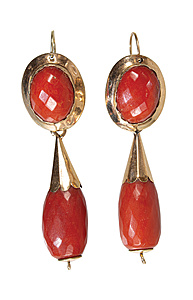 Ohrhänger Ende 20.Jhd., GG 585/000 (geprüft), im Oberteil facettierte Korallen-Cabochons, 2 abgehängte tropfenförmige Korallenpampeln-Pampeln, H = 57,5 mm, Pampeln abnehmbar, total 14,0 g, mit Schatulle !