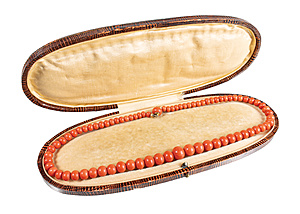 Korallenkette KLASSIKER, Schließe GG 585/000, Korallen im Verlauf, D = 5,0-10,4 mm, L = 43,5 cm, total 31,7 cm, mit Schatulle !